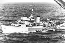 Flower-class corvettes like West York serving with the Royal Canadian Navy during the Second World War were different from earlier and more traditional sail-driven corvettes.[2][3][4] The "corvette" designation was created by the French as a class of small warships; the Royal Navy borrowed the term for a period but discontinued its use in 1877.[5] During the hurried preparations for war in the late 1930s, Winston Churchill reactivated the corvette class, needing a name for smaller ships used in an escort capacity, in this case based on a whaling ship design.[6] The generic name "flower" was used to designate the class of these ships, which – in the Royal Navy – were named after flowering plants.[7]