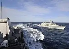 In January 2015, Winnipeg was deployed in the eastern Pacific as part of Operation Caribbe 2015, part of a joint multinational effort to eliminate illegal trafficking through the waters around Central America and the Caribbean nations.[18] Winnipeg was deployed to Operation Caribbe for three weeks in June, after which the ship transited the Panama Canal to join NATO's Operation Reassurance in the Mediterranean Sea. The ship left the Mediterranean headed towards the Pacific after being relieved by sister ship Fredericton.[19][20] In January 2016, she made port visits to Penang, the first Royal Canadian Navy ship to do so, and Singapore.[21][22] Winnipeg returned to Esquimalt on 23 February.[23]