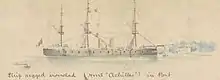She served in the Channel Fleet until 1868. After a refit and her first major re-armament, Achilles became the guardship at Portland until 1874 when she was again re-armed. Upon its completion in 1875, the ship became guardship at Liverpool until 1877 when Captain William Hewett, VC, assumed command. In 1878 she was one of the ships in the Particular Service Squadron which Admiral Geoffrey Hornby took through the Dardanelles at the time of the Russian war scare in June–August 1878 during the Russo-Turkish War. Achilles accidentally collided with the flagship of the Mediterranean Fleet, HMS Alexandra, on 4 October 1879, but was only lightly damaged by Alexandra's propeller.[19][20] The ship rejoined the Channel Fleet in 1880 and was paid off in 1885.[21]