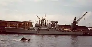 HMS Achilles was a Leander-class frigate of the Royal Navy.[1] She was built by Yarrow at Glasgow. She was launched on 21 November 1968 and commissioned on 9 July 1970.[2] She was sold to Chile in 1991 and served in the Chilean Navy as Ministro Zenteno. She was washed away from her berth at Talcahuano by a tsunami following the February 2010 Chile earthquake, and ran aground on the coast a few kilometres to the north. She was scuttled the following month by the Chilean Navy as a danger to navigation.