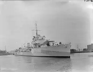 On the outbreak of the Second World War, Arrow was deployed at Portland with the 18th Destroyer Flotilla for anti-submarine patrol and convoy defence duties. She carried out these duties into October, and on 24 October put into Devonport Dockyard to undergo repairs to fix turbine defects. These repairs lasted until December, and on her return to service in January Arrow was nominated to join the 16th Destroyer Flotilla at Portsmouth. She joined the flotilla on 10 January having completed her post refit trials, and the following day was, with her sisters Achates and Anthony, detached to escort the battleship Royal Sovereign part of the way on her journey to Halifax to cover the Atlantic convoys.[1] Arrow was detached on 30 January and returned to Devonport to undergo repairs to her machinery.