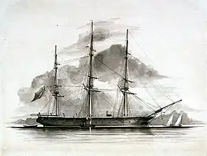 HMS Brisk was a 14-gun wooden-hulled screw sloop designed by the Committee of Reference as part of the 1847 program. She is considered an enlarged Rattler with the design approved in 1847.[1] She was ordered on 25 April 1847 from Woolwich Dockyard as a 10-gun sloop,[2] but the guns were later increased due to the Russian War, to 14 guns by increasing the number of 32-pounder guns. She was launched on 2 June 1851 from Woolwich Dockyard.[3] She served in the Russian War of 1854- 55 and as part of the West African anti-slavery patrol, with a final commission on the Australian Station. She was sold in 1870 into mercantile service.