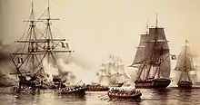 Amaranthe's boats, assisted by boats from the schooner Express, boarded the second schooner and set fire to her too.[22] This expedition cost Amaranthe her sailing master, Joshua Jones, who was severely wounded. The other British vessels that contributed boats also had casualties. Including the losses in the earlier fighting before Amaranthe arrived, the British had lost some 12 men killed, 31 wounded, and 26 missing (drowned or prisoners) for little gain.[22] Brenton was promoted to Post-captain soon after the battle, with the promotion being back dated to 13 December, the date of the battle. In 1847 the Admiralty authorised the award of the NGSM with the clasp "Off the Pearl Rock 13 Decr. 1808".