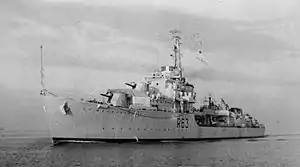 Concord served in the Far East between 1947 and 1957 as part of the 8th Destroyer Squadron.[1] In 1949, she was involved in the Amethyst Incident. Concord entered the River Yangtze and proceeded to a point off the Woosung Fort, the location of a heavy gun battery 38 miles (61 km) from the mouth of the river. Lieutenant Commander Kerans, commanding the sloop Amethyst, had from the beginning requested that Concord should meet him there to give protection at the most critical point of his escape. Concord provided sailors to fill out the thinned ranks aboard Amethyst and the two ships made their way downriver There was no boom at the mouth of the river. After handing over the escort of Amethyst to other vessels, Concord was ordered to Japan. Concord went on to serve during the Korean War.