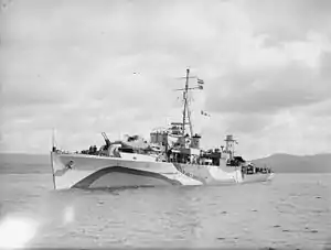 At the end of the work, she was transferred for service with the British Pacific Fleet, arriving in Sydney on 17 February 1945 and joining the fleet at Manus Island on 4 March 1945.[27] Crane was employed in escorting the replenishment ships of the fleet train supporting the carriers of the fleet,[28] supporting operations against Japanese airbases during the Battle of Okinawa in March–May 1945 [29] She continued to protect replenishment ships in support of the British Pacific fleet until the end of the war,[30] Crane was present in Tokyo Bay on 2 September 1945 during the signing of Japan's surrender.[31] She was deployed on a Hong Kong-based patrol until refitted at Brisbane, Australia from October 1945 to January 1946.[16][32]