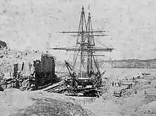 She served in the Mediterranean Station between 1854 until 1857 and was in the Black Sea during the Crimean War. She was part of the Channel Squadron between 1857 until 1859. On 24 October 1858, Curacoa ran aground on the Pelican Reef, off Smyrna, Ottoman Empire. All onboard were rescued. She was refloated on 26 October with assistance from USS Macedonian and taken into Smyrna on 28 October.[2][3][4][5] On 4 February 1859, Curacoa collided with the British merchant ship Fleta in the English Channel.[6] She then was sent to North America and West Indies Station and served between 1859 until 1862. Afterward, she went to the Australia Station, where she remained until 1866. She was the flagship of the Australia Station from 20 April 1863 until May 1866, having had her armament reduced to 23 guns in 1863.