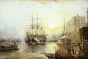 Fisgard returned to Woolwich,[3] where she was designated as the harbour flagship and was fitted for a commodore. Commodore James John Gordon Bremer hoisted his flag aboard her on 24 October 1847, the first of a number of such officers. On 20 December 1858 Fisgard became the flagship of Commodore James Robert Drummond, the commander-in-chief at Woolwich. In 1861, She is the guard-ship of the Port of London.[5] Her last commodore was William Edmonstone, who took command on 6 April 1868.[3] Between 1848 and 1872 she was used to train engineers for the navy, and was the nominated depot ship for personnel stationed ashore.[6] Additionally, between 1853 and 1873 she served as the Headquarters ship of the Royal Naval Coast Volunteers.[7]