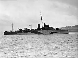 Fleetwood was recalled to Home waters following the outbreak of the Second World War, arriving at Portland on 11 October 1939 and was tasked with providing escort to convoys along the East coast of Britain.[11] In April 1940, Germany invaded Norway, with Fleetwood attached to the Home Fleet. She provided anti-aircraft cover for landings at Åndalsnes and Molde, and when the sloop Pelican was damaged by German bombs, Fleetwood towed the damaged ship back to Lerwick in Shetland. She then returned to Romsdalsfjord, relieving the damaged sloop Black Swan on 28 April. On 29 April she was near missed by a German bomb, which caused little damage,[13] and was herself relieved on 30 April by the sloop Auckland and the cruiser Calcutta, having fired all her anti-aircraft ammunition. Fleetwood evacuated 340 troops on her return to Britain.[14][11][15] On 11–12 May 1940 Fleetwood helped to land troops at Mo i Rana, and came under heavy air attack.[16] On 27 May 1940, Fleetwood helped escort the badly damaged destroyer Eskimo, which had her bow blown off at the Second Battle of Narvik, from Harstad back to Britain.[17]