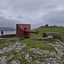 Despite her obsolescence, she saw service in the First World War, first with the 10th Cruiser Squadron on Northern Patrol and from 1915 as a depot ship for this group, based in the Shetland Islands. Two of her QF 6-in Mk I guns were dismounted from the cruiser and moved to Swarbacks Head on Vementry, a headland that overlooks the entrance to Swarbacks Minn between the islands of Vementry and Muckle Roe for shore based defence. The two guns still exist on this site and can be visited.[7]