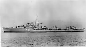 When repaired, Jackal was deployed in support of Allied forces in the Norwegian campaign, escorting troopships and carrying out shore bombardments, before being transferred to Harwich, as part of the Nore Command, carrying out convoy escort and patrol operations. In July 1940, Jackal took part in the Dunkirk evacuation, patrolling to protect the evacuation ships.[6] Following Dunkirk, Jackal returned to the routine of convoy escort and patrols. On 11 October Jackal, together with the battleship HMS Revenge and the destroyers Javelin, Jaguar, Jupiter, Kelvin, Kipling and Kashmir, shelled Cherbourg harbour.[7] On 29 November 1940, Jackal, Javelin, Jupiter, Jersey and Kashmir were deployed to try to intercept a sortie by the German destroyers Karl Galster, Hans Lody and Richard Beitzen that resulted in Jackal's sister ship Javelin, commanded by Lord Louis Mountbatten, being torpedoed and badly damaged.[8]