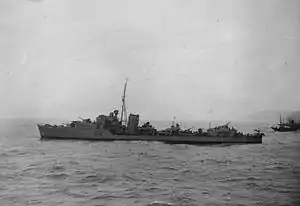 The ships were armed with six 4.7-inch (120 mm) Mark XII guns in twin mounts, two superfiring in front of the bridge and one aft of the superstructure. For anti-aircraft (AA) defence, they had one quadruple mount for 2-pounder "pom-pom" guns and two quadruple mounts for the 0.5 inch Vickers Mark III anti-aircraft machinegun. The K-class ships were fitted with two above-water quintuple mounts for 21-inch (533 mm) torpedoes.[2] The ship was fitted with two depth charge throwers and one rack for 20 depth charges.[1]