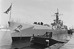 HMS Leander (F109) was the nameship of the Leander-class frigate of the Royal Navy (RN). She was originally intended to be part of the Rothesay class and would have been known as Weymouth. Leander was, like the rest of the class, named after a figure of the classical Greek mythology. She was built by the Harland & Wolff shipyard in Belfast, Northern Ireland and was launched on 28 June 1961. She was commissioned on 27 March 1963.