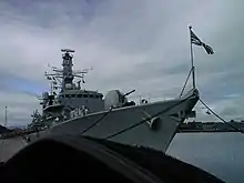 Montrose forward-deployed to Bahrain in April 2019, where she will remain until 2022 carrying out an array of joint security operations including counter-piracy, counter-narcotics and boarding operations to support allies in the region and to protect the UK's interests.[30] In early July 2019, amid rising tensions between the United Kingdom and Iran, Montrose issued radio warnings to boats believed to belong to the Islamic Revolutionary Guard Corps Navy[31] which were attempting to impede the passage of the British commercial vessel British Heritage. US officials stated that five Iranian boats were involved, while some UK sources say only three were involved. The incident occurred in the Strait of Hormuz.[32] According to some tabloid sources, Montrose had her 30 mm deck guns trained on the Iranian boats.[31] Montrose was joined by HMS Duncan which was ordered to the Persian Gulf on 12 July 2019 in response to threats against British shipping by Iran.[33] On 19 July Montrose warned the Islamic Revolutionary Guard by radio against the seizure of the British-flagged Stena Impero but was not close enough to prevent the seizure.[34] In September 2019, Stena Impero was released and HMS Duncan returned to Portsmouth.[35][36] On 12 October it was reported that Montrose along with her French counterpart, Jean Bart, were able to capture 170 kilograms (370 lb) of illegal drugs. These drugs had an estimated worth of $1 million. The ships were able to catch the drug-smuggling dhow while operating in the Arabian Sea.[37]