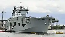 HMS Ocean was a Landing Platform Helicopter, formerly the UK's helicopter carrier and the fleet flagship of the Royal Navy.[6] She was designed to support amphibious landing operations and to support the staff of Commander UK Amphibious Force and Commander UK Landing Force. She was constructed in the mid-1990s by Kvaerner Govan on the River Clyde and fitted out by VSEL at Barrow-in-Furness prior to trials and subsequent acceptance in service. Ocean was commissioned in September 1998 at her home port HMNB Devonport, Plymouth.