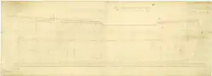 The Venus class of 36-gun frigates were designed by Thomas Slade, the Surveyor of the Navy and former Master Shipwright at Deptford Dockyard. Alongside their smaller cousin, the 32-gun Southampton class, the Venus-class represented an experiment in ship design; fast, medium-sized vessels capable of overhauling smaller craft and singlehandedly engaging enemy cruisers or privateers.[2] As a further innovation, Slade borrowed from contemporary French ship design by removing the lower deck gun ports and locating the ship's cannons solely on the upper deck. This permitted the carrying of heavier ordinance without the substantial increase in hull size which would otherwise have been required in order to keep the lower gun ports consistently above the waterline.[3] The lower deck was instead used for additional stores, enabling Venus-class frigates to remain at sea for longer periods without resupply.[4]