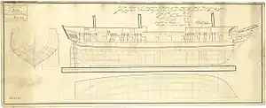 Princess Charlotte was designed by George Record of the Kingston Royal Naval Dockyard in Kingston, Upper Canada. The frigate was constructed under private contract by the master shipwright John Goudie. The vessel measured 755 90⁄94 tons burthen and was 121 ft 0 in (36.9 m) long overall and 100 ft 0+3⁄8 in (30.5 m) long at the keel.[lower-alpha 1] The frigate had a beam of 37 ft 8 in (11.5 m) and a draught of 14 ft 4 in (4.4 m). The frigate's hold had a depth of 8 ft 8+1⁄2 in (2.7 m). The frigate was pierced for 40 gunports but carried 42 guns. Princess Charlotte was armed with twenty-four 24 pdr (11 kg) long guns on her upper deck and sixteen 32 pdr (15 kg) carronades and two 68 pdr (31 kg) carronades on her quarterdeck and forecastle. The vessel had a complement of 280 officers and enlisted.[2][3]