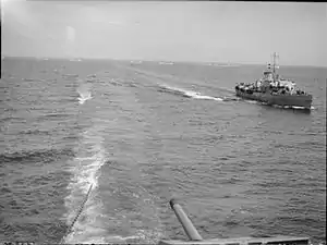 On 21 November 1940, Rhododendron, part of the escort for Convoy OB244, attacked the German U-boat U-103 with depth charges, helping to drive the submarine away from the convoy. Although U-103 escaped unscathed, this attack led to the incorrect claim that Rhododendron had sunk U-104.[5][2] That same day, she picked up 36 survivors from the merchant ship Daydawn, which earlier that day had been sunk by U-103.[2] At the beginning of 1941, Rhododendron was part of the 8th Escort Group.[6] On 17 January 1941, she detonated a mine in Liverpool harbor, knocking out her engines and steering gear and causing minor structural damage. Rhododendron was under repair at Liverpool for three months.[7][8][2] On 28 July 1941, she picked up 26 survivors from the Lapland, a merchant ship which was torpedoed by U-203.[2][9] On 1 October 1941, Rhododendron was part of the 36th Escort Group, based at Liverpool.[10]