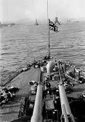 Russell and her four Duncan-class sisters, as well as the battleships of the King Edward VII class, were temporarily transferred to the Channel Fleet on 2 November 1914 as reinforcements in the face of German Navy activity in the Channel Fleet's area.[5] The following day, the German fleet raided Yarmouth; at the time, Russell and the rest of the 3rd Squadron were dispersed on the Northern Patrol, and were thus unavailable during the German attack.[13] On 13 November 1914 the King Edward VII-class ships returned to the Grand Fleet, but Russell and the other Duncans stayed in the Channel Fleet, where they reconstituted the 6th Battle Squadron on 14 November 1914, with Russell serving as the squadron's flagship. The squadron was based at Portland, although it transferred immediately, 14 November, to Dover. However, due a lack of antisubmarine defences at Dover, particularly after the harbour's anti-submarine boom was swept away in a gale, it returned to Portland on 19 November 1914.[5][14]