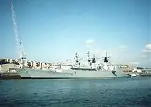 5 February 2002 saw Sheffield deployed to the Standing Naval Force Mediterranean to replace Chatham. The mission was anti-terrorism by monitoring merchant shipping. There were also visits to Turkey, Sicily, Crete, Spain and Algiers.[6] Sheffield was the flagship of Commodore Angus Somerville. Tuesday 26 February saw Sheffield assist the Spanish submarine Siroco, whilst participating in the exercise DOGFISH 2002. The submarine needed medicines for a sailor whilst in the Ionian Sea.[7]
