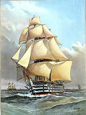 With a displacement of 6,959 tons, she was the largest wooden battleship which ever entered service. She was also the world's largest warship until the completion of HMS Warrior, Britain's first ironclad battleship, in 1861.
