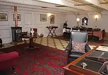 The majority of the crew lived on the single gun deck of the Warrior; these crewmen slept in hammocks slung from the sides and deck beams, with up to 18 men between each pair of guns. The officers berthed in the rear of the ship in small individual cabins; the wardroom was also the officers' mess. The captain had two spacious, well-furnished cabins.[28]