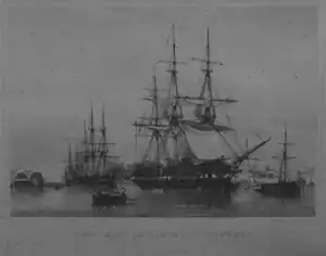 In mid-October there were plans for De Ruyter to make a second cruise in the Mediterranean starting 1 November. On 5 November she indeed sailed from Texel, and on 6 November she passed Dungeness. On 26 November she arrived in Malta. On 20 December 1856 she arrived in Smyrna. On 4 January 1857 the commander of De Ruyter sent a report about shipping in the Levant to The Hague. On 9 January she left for Scala Virulate and Athens.[14] She was expected to leave Athens for Malta on 23 February. On 8 March the frigate Doggersbank was waiting in Mahon. The plan was that it would transfer part of its crew and supplies to De Ruyter before returning home. By 5 April this had been done, and Doggersbank would return home on the 6th. On 1 May De Ruyter arrived in Toulon. On 19 May she arrived in Marseille, towed in by the Bulldog. On 26 May she sailed for Tripoli. On 2 June the De Ruyter arrived in Tripoli, the first Dutch warship to do so in 20 years. She had on board the Dutch consul Ridder de Testa (probably Jhr. mr. Emilius Franciscus Eliodorus Testa (1821-1896)) and his family, who had been on leave in the Netherlands. On 3 June the officers and cadets went on shore, and the consul introduced them to the Pasha and the consuls of other powers. Local authorities then made a counter visit to the Dutch consulate. On the 4th there was a dinner and music at the consulate. In the evening of the 5th De Ruyter left Tripoli.[15] On 20 June De Ruyter arrived back in Toulon from Tripoli.