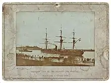 On 25 November 1896 the pilot for Buenos Aires came on board. De Ruyter anchored before the city, but after some doubts about the harbor, she continued to the harbor of La Plata, where she attached to the quay. On 4 December De Ruyter got a telegram to remain in Buenos Aires till the arrival of Van Speyk. This telegram had to do with a rebellion in Uruguay. On 11 December Van Speyk arrived. On 12 December De Ruyter then sailed from before La Plata. On 29 December she passed the prime meridian, at 42.20 S. The crew continuously measured water and air temperature in order to determine the chance for icebergs. On 9 January these were indeed sighted, one of them 21 m high. On 7 February 1897 De Ruyter entered the Emmahaven of Padang.[53] After bunkering, she left again on the 16th, and arrived in Tanjong Priok, Batavia, on 19 February 1897.[54]