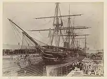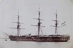 On 25 March 1891, De Ruyter was ready for action after repairs to the hull, boilers and machinery at Willemsoord.[34] The gun ports were also changed.[35] On 20 March De Ruyter left Texel, commanded by Captain W. Baron van Hogendorp. On 21 March she reached Vlissingen, where she moored in the Binnenhaven, behind the sea lock. On 25 March she left Vlissingen. De Ruyter tried to make the most use of her sails, but finally had to use her engines in order not to hit the Portuguese coast. The rest of the trip De Ruyter did not sail fast, but her captain was satisfied. He noted that close-hauled in light winds, she always kept some speed, while with more wind, she was a good sailer. On 30 April she arrived before the Suriname River.[36] On 3 May 1891 De Ruyter left Suriname, and set course for Curaçao. On 9 May 1891 she arrived there, and anchored next to Johan Willem Friso.[37]