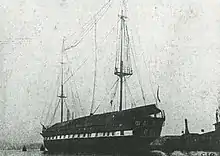 In August 1875 it became known that the Wassenaar would be based in Amsterdam as a training/lodging ship for young sailors. On 4 September 1875 the Wassenaar arrived at the Rijkswerf Amsterdam.[52] In late March 1876 the training ship Wassenaar was described as making a very good impression. The basics had been taken care of: light, fresh air and water. On the upper deck the commander and his wife had sizable lodgings: A well made cabin and saloon, a guest room a bath room and some smaller cabins, very neat but not luxurious. Of course there was a kitchen and room for a maid. The upper deck has ample space for the boys to breath the fresh air. On the main deck there was a spacious long room and cabins for the officers. Midships there was a space divided into six class rooms, for education and activities that could not be done on deck in bad weather. Further to the front were guns to teach about artillery. At the bow was a bath room and the sick bay with a pharmacy and medical supplies. One deck lower there were similar quarters for the teachers and the non-commissioned officers, who were certainly pleased with their lodgings. The space that had been used to house the steam engine and boilers had been made into a neat gymnasium. In front of that was the space were the boys ate and slept in their hammocks. There was a jail on board, but only four military police on a capacity of 500 boys.[53] The brig Ternate would be added to the Wassenaar for actual sailing practice on the Zuiderzee.
