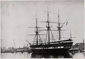 The Wassenaar was built using many parts of the Piet Hein. The Piet Hein had been laid down as a ship of the line of 74 guns. On 1 January 1834 she was under construction in Amsterdam.[16] In 1844 the Piet Hein was mentioned as renamed to Wassenaar.[17] In 1850, the Wassenaar was simply mentioned as a ship of the line of 74 guns under construction in Amsterdam.[18] In January 1850 Vice-Admiral Lucas wrote to the king that not half of the ship had yet been finished. Also that the form of the ship was no longer in accordance with the time. It would be best to take of the upper part, make some changes to the rear, and then to finish it as a frigate first class. That would result in a heavy frigate meeting modern demands. Because the wooden slipway parts under the ship had rotted away after 17 years, the ship would be taken apart and laid down again on the slipway of the Tromp. The foremast, bowsprit and sails of the ship Zeeuw would be used.[5] In 1851 the Admiraal van Wassenaar was mentioned as a Ship of the line of the Second class. It had been laid down in 1833 and was to have 74 guns, and was finished 7/20, but she would be finished as a frigate.[19] In 1852 the Wassenaar was mentioned as a frigate of the first class of 54 guns originally laid down as a ship of the line in Amsterdam in 1833.[20]