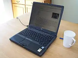 The HP OmniBook 300 (OB300) is a "superportable" laptop released in 1993 that weighed only 2.9 pounds and measured 1.4 × 6.4 × 11.1 inches. It is powered by an Intel 386SXLV processor, featured a full-size keyboard, a pop-up mouse, and a 9-inch VGA screen.[2][3][4] Due to storage limitations, the OmniBook 300 included Microsoft Excel and Microsoft Word pre-installed in ROM, which was and remains unusual to this day.[5] It had two PCMCIA slots for additional memory, modem, network card or other peripheral. One of its outstanding features was "Instant On". It was sold in three storage configurations: no mass storage (F1030A at US$1,515), 10MB flash disc (F1031A at US$2,375), or 40 MB hard drive (F1032A at US$1,950). Compared to the hard drive, the flash memory disk reduced the weight and storage capacity but increased battery life. It came with reduced copies of MS-DOS 5.0 and Windows 3.1. The "International English" version of the OmniBook 300 used code page 850 (rather than the more common code page 437) as hardware code page.
