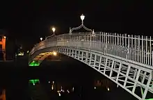 The Ha'penny Bridge (/ˈheɪpni/ HAYP-nee; Irish: Droichead na Leathphingine, or Droichead na Life), known later for a time as the Penny Ha'penny Bridge, and officially the Liffey Bridge, is a pedestrian bridge built in May 1816 over the River Liffey in Dublin, Ireland.[2][4] Made of cast iron, the bridge was cast in Shropshire, England.[5]