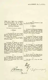 The Habsburg Law (Habsburgergesetz (in full, the Law concerning the Expulsion and the Takeover of the Assets of the House of Habsburg-Lorraine) Gesetz vom 3. April 1919 betreffend die Landesverweisung und die Übernahme des Vermögens des Hauses Habsburg-Lothringen) was a law originally passed by the Constitutional Assembly (Konstituierende Nationalversammlung) of the Republic of German-Austria, one of the successor states of dissolved Austria-Hungary, on 3 April 1919. The law legally dethroned the House of Habsburg-Lorraine as rulers of the country which had declared itself a republic on 12 November 1918, exiled them and confiscated their property. The Habsburg Law was repealed in 1935 and the Habsburg family was given back its property. However, in 1938, following the Anschluss, the Nazis reintroduced the Habsburg Law, and it was retained when Austria regained its independence after World War II.