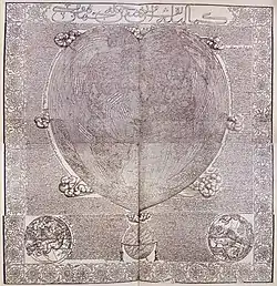 The map has specific European characteristics, in that it includes the use of Western terms,[1] suggesting Ahmet translated an older map into Turkish. In fact, throughout the map’s accompanying text, Ahmet emphasizes translation, stating that he “translated it from the language and alphabet of the Europeans into that of the Muslims”.[1] A further argument made against Ahmet's authorship is that the “heart-shaped form of the map had already been used by earlier European cartographers”.[2]