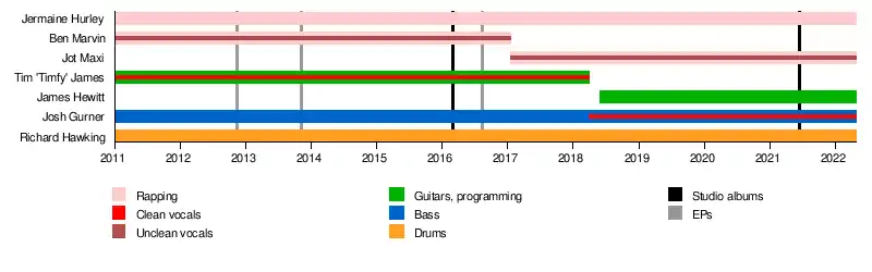 - Tim 'Timfy' James – guitars, clean vocals, programming (2011–2018)