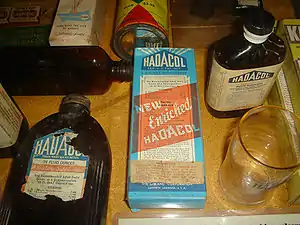 The label on the tonic's bottle clearly stated that the recommended dosage (1 tablespoonful taken 4 times a day) was to be taken "...in a 1/2 glass of water after meals and before retiring". However, some pharmacies in dry counties were known to sell it by the shot-glass and at least one bar in New Orleans' French Quarter was known to sell a "Tassel Cocktail" with Hadacol as an ingredient.[3] In Northbrook, Illinois, a suburb of Chicago, sales of Hadacol were limited to liquor stores.[4]