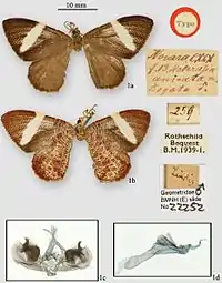 Adults have a cream-white band, originating on the costa near the midpoint and running diagonally toward a point 1⁄3 above the tornus, rounding off and ending without touching the margin. Distal to this band is dark brown scaling to the wing apex. Proximal to the band is dark brown scaling which becomes brighter toward the wing base. At the terminus of the wing veins are small white crescents which are usually worn off in flown specimens. The hindwing is the brownish color of the forewing base and with larger marginal crescents at the vein termini. The underside is repeated with some slight variation.[1]