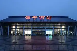 Haining West railway station (simplified Chinese: 海宁西站; traditional Chinese: 海寧西站; pinyin: hǎiníng xī zhàn) is a railway station on the Shanghai–Hangzhou high-speed railway located in Haining, Jiaxing, Zhejiang, China. It opened on 26 October 2010.[1]