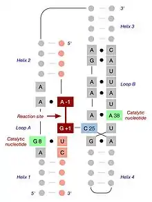 Studies of this reaction in multiple ribozymes have served to establish that the reaction chemistry (catalytic mechanism) is an endogenous property of the RNA molecule itself and is not mediated by metal ions, as is true for some protein enzymes and some other ribozymes.[10] Moreover, cleavage activity is still observed when Mg2+ is replaced by [Co(NH3)6]3+.[11] Co3+ binds NH3 so tightly in solution that NH3 does not dissociate to any appreciable extent, and therefore does not become protonated. This suggests there is no metal-catalyzed proton transfer or direct coordination to the RNA, but instead metals are only required for folding. Furthermore, in crystal structures of a ribozyme-inhibitor complex and a transition state mimic, it was shown that the three-dimensional architecture splays apart A-1 and G+1, positioning the 2'-OH of A-1 for an in-line nucleophilic attack on the scissile phosphate linkage. Additionally, G8, A38, and A9 have been suggested to play roles in the catalysis by deprotonating the 2'-OH of A-1, stabilizing the developing negative charge of the pentacoordinate phosphate oxygens, and protonating the 5'-O leaving group of G+1.[12][13]