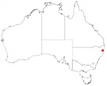This hakea is found near Dorrigo in northern New South Wales where it grows in shallow soil on hillsides on rock in light scrub or depauperate warm-temperate rainforest.[2][3]