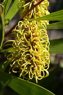 Hakea trineura is a flowering plant in the family Proteaceae and is endemic to Queensland. The branches and leaves are covered with rusty hairs and the pendulous flowers are greenish-yellow.