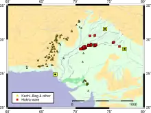Hakra Ware culture is a material culture which is contemporaneous with the early Harappan Ravi phase culture (3300–2800 BCE) of the Indus Valley.[1][2] Hakra Ware culture is characterized by handmade vessels with mud and grit applied to the surface. The Hakra Wares culture also made structures in the form of subterranean dwelling pits, cut into the natural soil. The walls and floor of these pits were plastered with the yellowish alluvium of the Hakra valley.[3] The first example was found near Jalilpur on the Ravi River about 80 miles (130 km) southwest of Harrappa in 1972.[4] According to Rao, Hakra Ware has been found at Bhirrana, and is pre-Harappan, dating to the 8th–7th millennium BCE.[5][6][7]