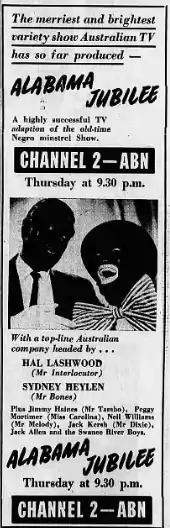 Hal Lashwood's Alabama Jubilee was an Australian television variety series hosted by Hal Lashwood which aired from 1958 to 1961 on ABC. It was essentially a minstrel show, with some of the performers appearing in blackface makeup.[2] In 1960, it was retitled Hal Lashwood's Minstrels.[3]