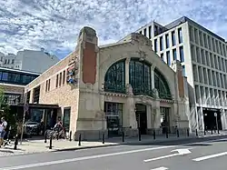The exterior was decorated with sculptures and carved cartouches featuring the mermaid, a symbol of Warsaw, and animal or food-related themes.[11] The main central hall was 77 meters in length by 27 meters in width at the time of its completion.[12] The two entrance wings were 15 meters by 15 meters each. The building was considered extremely modern for its time and possessed all the necessary conveniences; the steel-framed arcade had booths and cubicles specifically designed for each individual trade – butchers were provided with marble tabletops for cutting meat, fishmongers with pools and grocers were equipped with cold rooms and coolers.[13] Despite this, little space was designated in the 'cour d'honneur' for horse carts and wagons which transported the stock food to the Hall. A considerable problem was also the size of Koszykowa Street, which was narrow and soon became overcrowded, thus limiting access to the market.