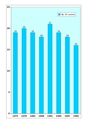 The clerical population of England seems to have reached a peak by about 1300 and fell greatly during the Black Death.[61] The number of Premonstratensians is thought to have fallen by a little under a third during this disaster. Poll tax returns for Halesowen show only 11 canons at the abbey in 1381.[62] Redman's visitations gives lists of canons at not quite regular intervals for the last quarter of the 15th century. Numbers at Halesowen are given in the accompanying column chart.