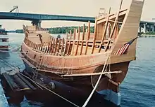 Half Moon is a replica of the famed ship that English mariner, Henry Hudson, sailed up the Hudson River in 1609. The ship was constructed between 1988 and 1989 at the Snow Dock in Albany, New York, its construction commissioned by Dr. Andrew Hendricks.[1] The ship's construction fulfilled Dr. Hendricks' dream to use the historic icon as an educational instrument, bridging the gap between the American way of life and the Dutch heritage in New York state. In March of 2015, the replica ship departed the Hudson River Valley to a new home, Hoorn, The Netherlands.[2] In February 2019, it was announced that the Hoorn government would not extend their contract to serve as the Dutch homeport of the Half Moon. Hoorn's contract expired on April 1, 2020.[3] The Half Moon is currently at port in Volendam, Netherlands. The board of directors of the New Netherland Museum have not announced what the future of the ship may hold.[4]