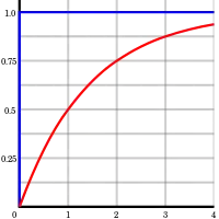 The diagram shows the increase in the quantity (red) in response to a step-change in the motive force that changes it (blue). The time-axis is in multiples of the half time. It can be seen that the quantity increases to one-half of its final value after one half time, to three-quarters after two half times, to seven-eighths after three half times, and so on.