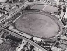 The Thrum Hall cricket ground had a speedway dirt track constructed around the cricket pitch and hosted the Halifax Speedway team until 1930.[1][2] A greyhound track replaced the speedway the following year with the greyhound track taking a most unusual shape in the form of a D shape to allow the cricket ground to remain in place inside the circuit.[3]