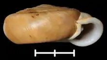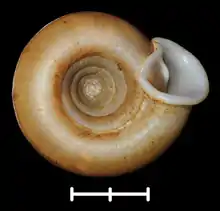 Similar species: Gudeodiscus dautzenbergi and some populations of Gudeodiscus villedaryi resemble Halongella schlumbergeri in terms of general, but the inner lamellae are entirely different.[2] Most Halongella schlumbergeri shells lack the anterior lamella.[2] Gudeodiscus dautzenbergi and Gudeodiscus villedaryi have strong, well-developed anterior lamella with an anteriorly elongated lower “leg”.[2] It is possible to distinguish Halongella schlumbergeri from the other two species without breaking the shell, on the basis of the long apertural fold reaching the callus, which is short in Gudeodiscus dautzenbergi and Gudeodiscus villedaryi, and has an elevated “knob” part in some distance from the callus.[2]