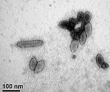 Transmission electron micrograph of virions, negatively stained with uranyl acetate. Scale bar = 100 nm.